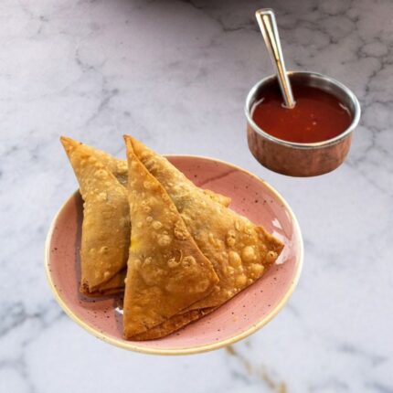 Popular fried or baked pastry, featuring a crispy, flaky shell typically shaped as a triangle. It is filled with a savory mixture of spiced, mashed potatoes, green peas, carrots, and onions, seasoned with aromatic spices like cumin and garam masala.
