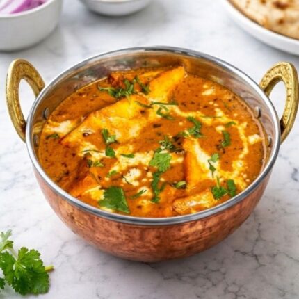 Popular, indulgent North Indian dish featuring soft, succulent cubes of paneer (Indian cottage cheese) simmered in a rich, creamy, and velvety tomato-based gravy.