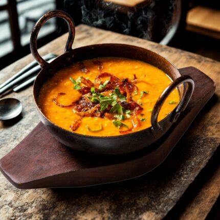 Consisting of cooked lentils (usually yellow lentils or red lentils) that are finished with a tarka—a sizzling, fragrant tempering of spices and garlic.