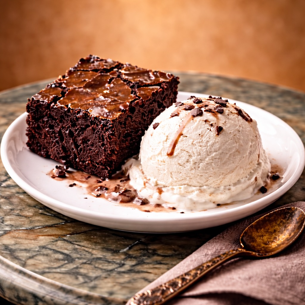 Warm, rich chocolate brownies served with a scoop of ice cream, creating a perfect balance of sweetness.